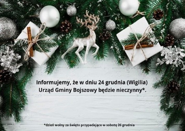 Urząd Gminy Bojszowy w dniu 24 grudnia ( Wigilia) będzie nieczynny.